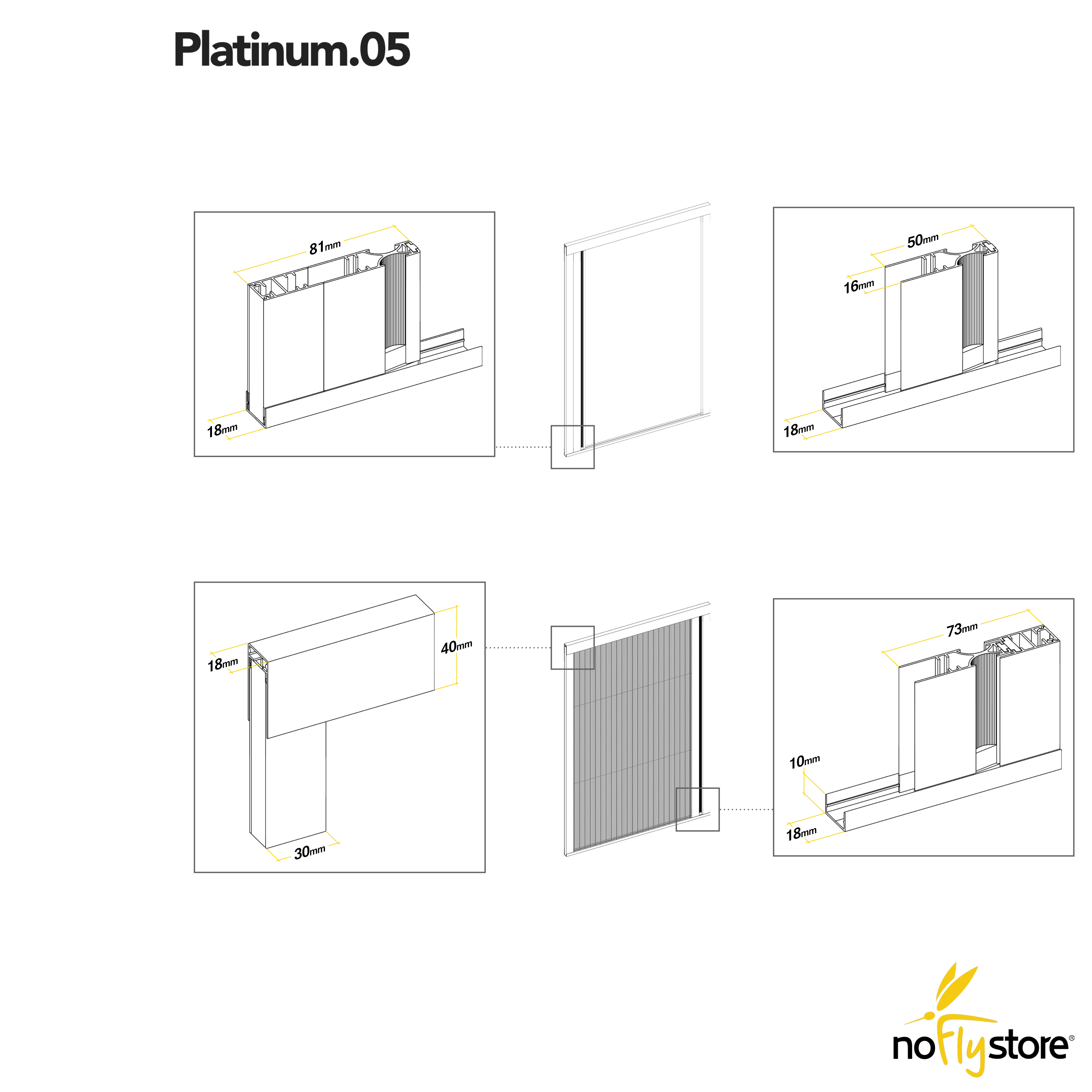Kaum bemerkbar. Platinum.05 ist das Alu-Fliegengitter, das am wenigstens Platz einnimmt. Die Ausmaße des plissierten Netz betragen bei der seitlichen Packung 13 Millimeter und nur 18 Millimeter insgesamt. Minimale Ausmaße bei der Installation, mehr Platz für Design und Zweckmäßigkeit.